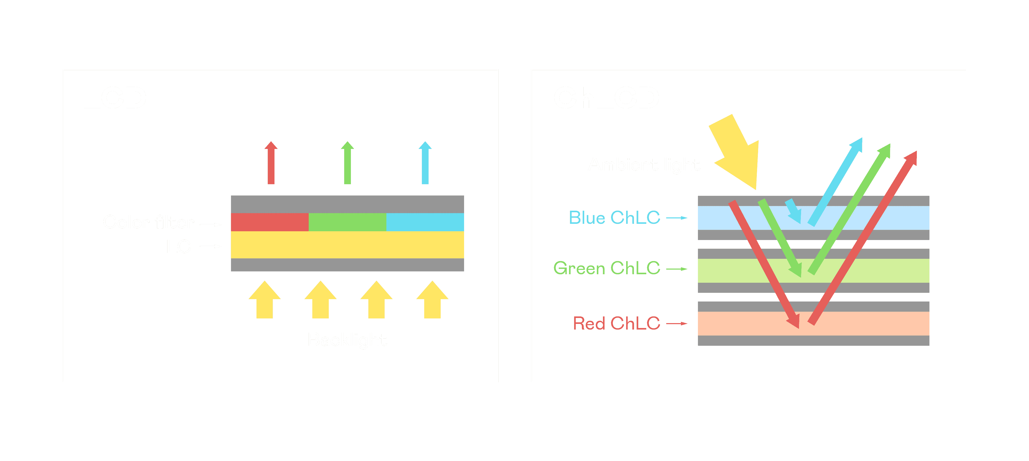 ChLCD 胆固醇液晶就如同纸张一样,,,透过反射环境光来显示影像,,,因此长时间观看不易造成人眼视觉疲劳,,,可达到护眼效果。。当处于户外阳光下使用,,,LCD 影像容易失真而不易观看,,但胆固醇液晶仍可维持较佳的影像品质。。。。
