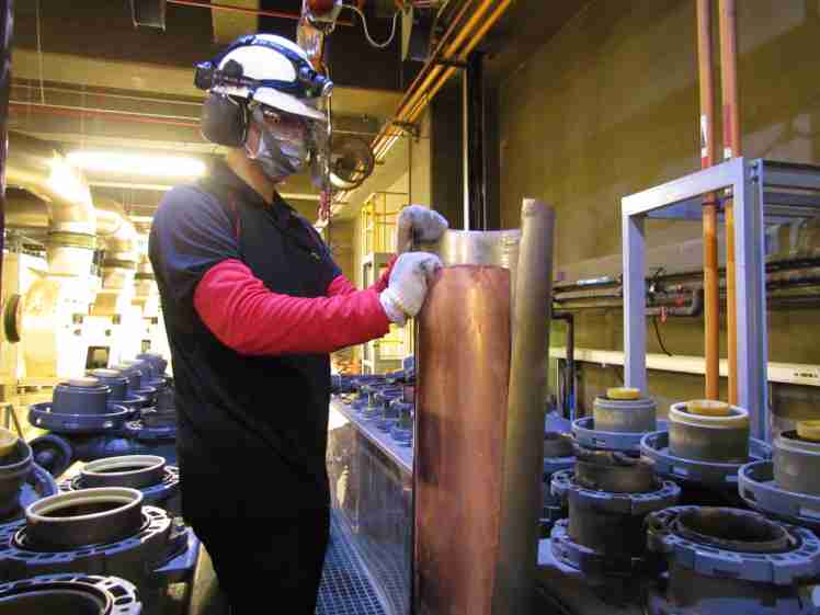 尊龙集团将废弃物转化成有效的工业或民生原物料,,图为废铜液淬炼后再制成纯度极高的铜管