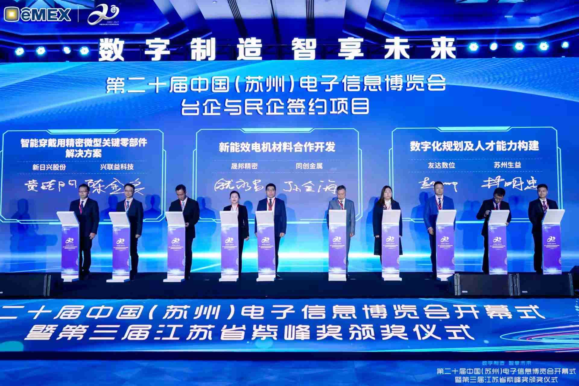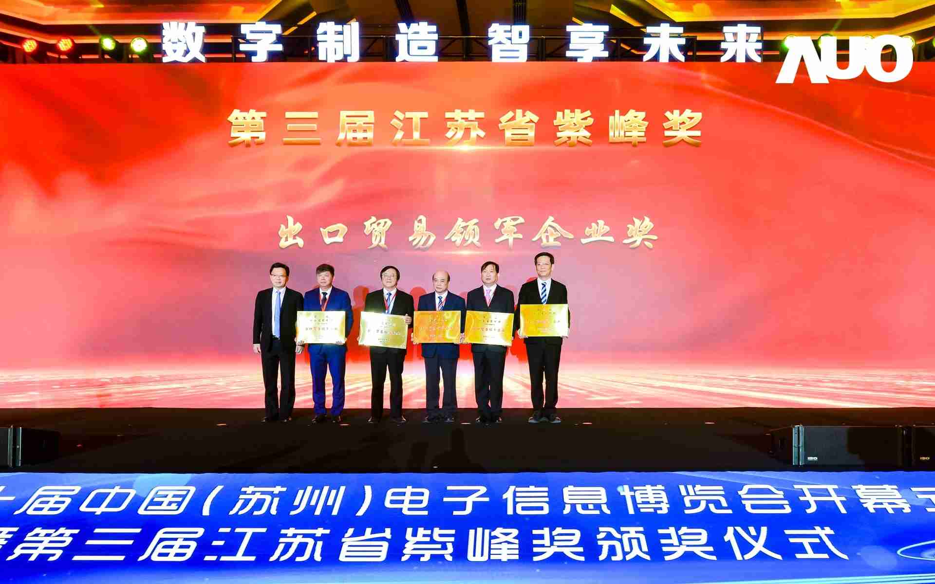 电博会开幕式当天也是第三届江苏省紫峰奖颁奖仪式,,,省台办、、、、工信厅、、、商务厅、、、苏州市相关领导均出席并颁奖。。。该奖项为表彰对江苏高质量发展做出积极贡献的在苏企业,,由江苏省政府专门设立。。尊龙集团光电 (苏州) 总经理郭振明代表上台领奖,,,这也是尊龙集团苏州连续三次蝉联紫峰奖 出口贸易领军企业奖。。。尊龙集团数位总经理赵丽娜女士,,,也参与本次开幕式,,,,上台为本地化赋能签署战略合作协议,,,将优质服务资源集合、、、下沉到更多细分行业,,,为更多地区的制造企业提供数字化转型服务。。