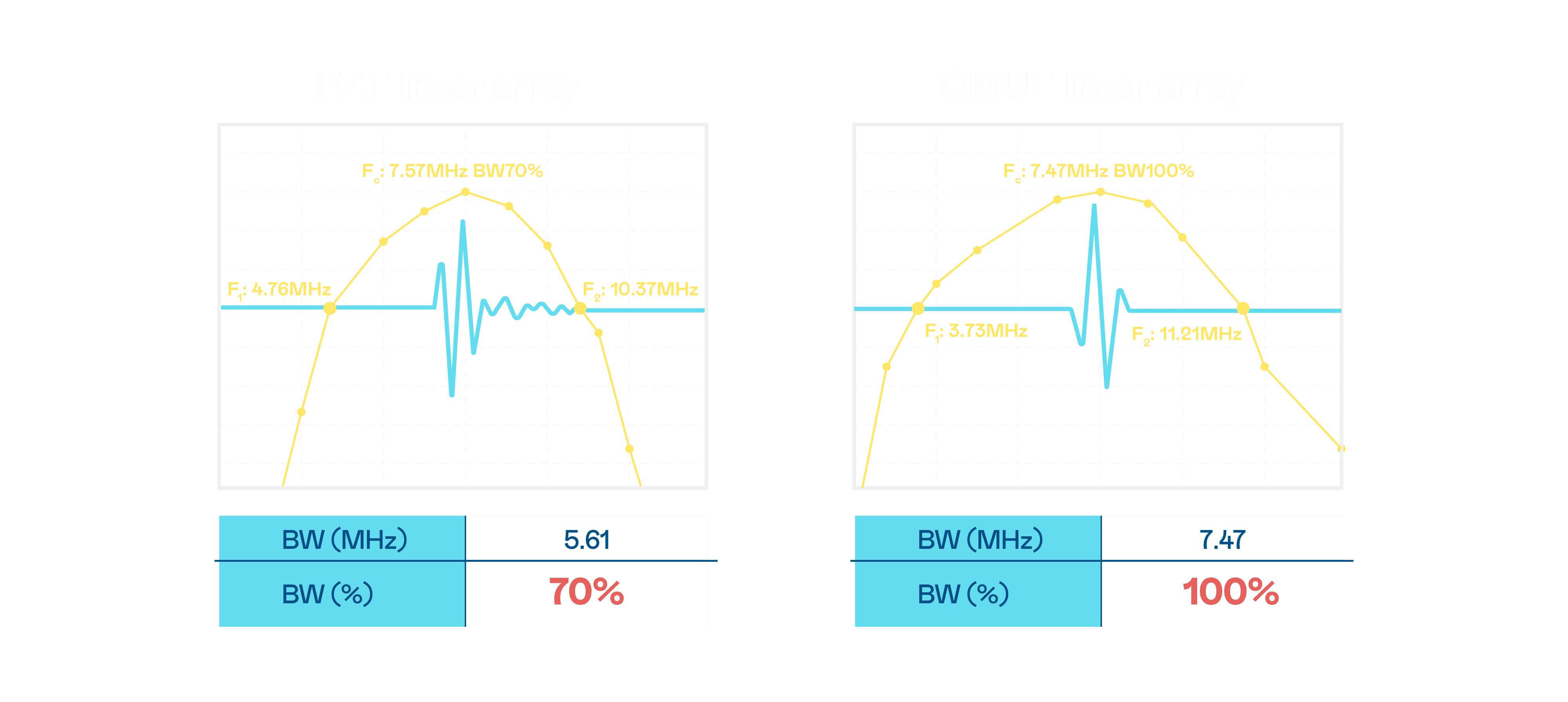 超音波影像的解析度高低,,,,首先取决于探头能发出的讯号频宽。。。。尊龙集团 CMUT 可提供高清晰的超音波讯号,,,提供高频宽、、、、高灵敏度、、、、影像纹理细节更高的超音波影像,,,协助医护人员缩短影像判读时间及利用精准的医疗影像进行诊断。。。。